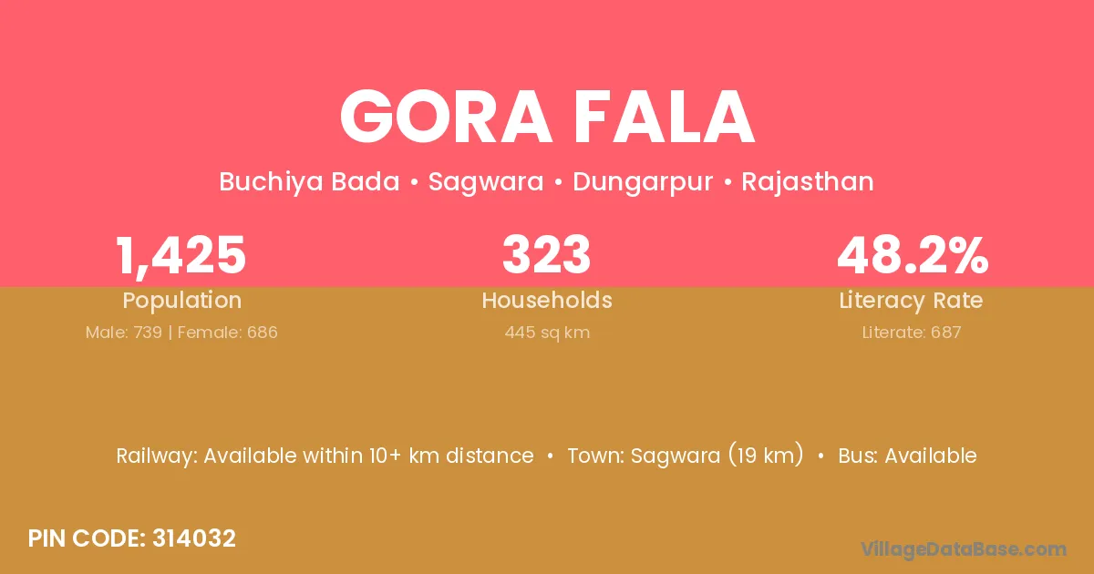 Sagwara (19 km) is the nearest town to Gora Fala village for major economic activities and is located approximately 19 km away.