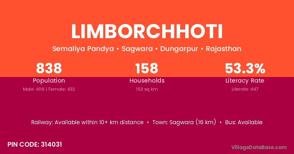 Sagwara (16 km) is the nearest town to Limborchhoti village for major economic activities and is located approximately 16 km away.