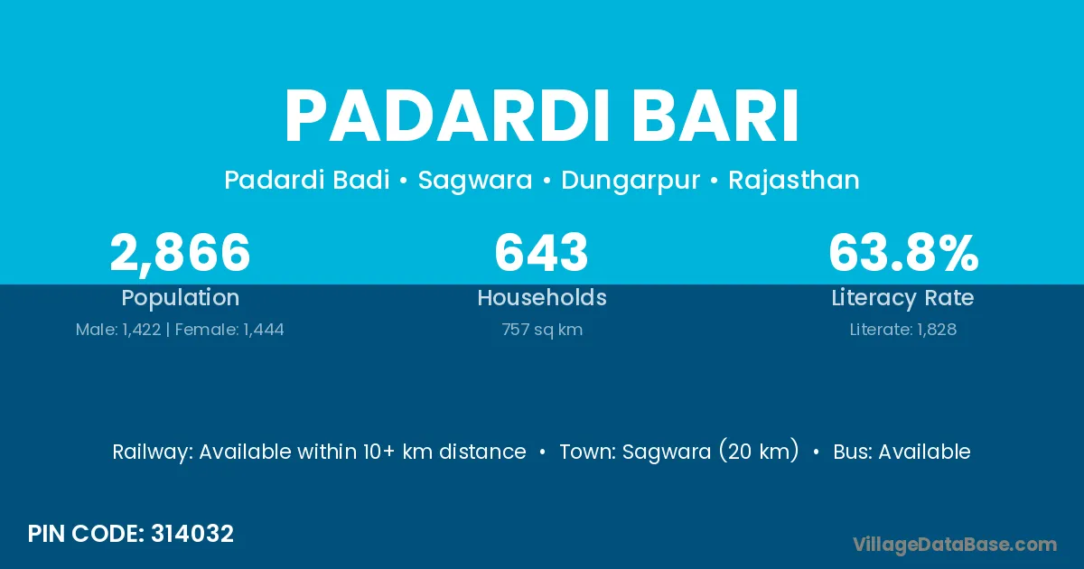 Sagwara (20 km) is the nearest town to Padardi Bari village for major economic activities and is located approximately 20 km away.
