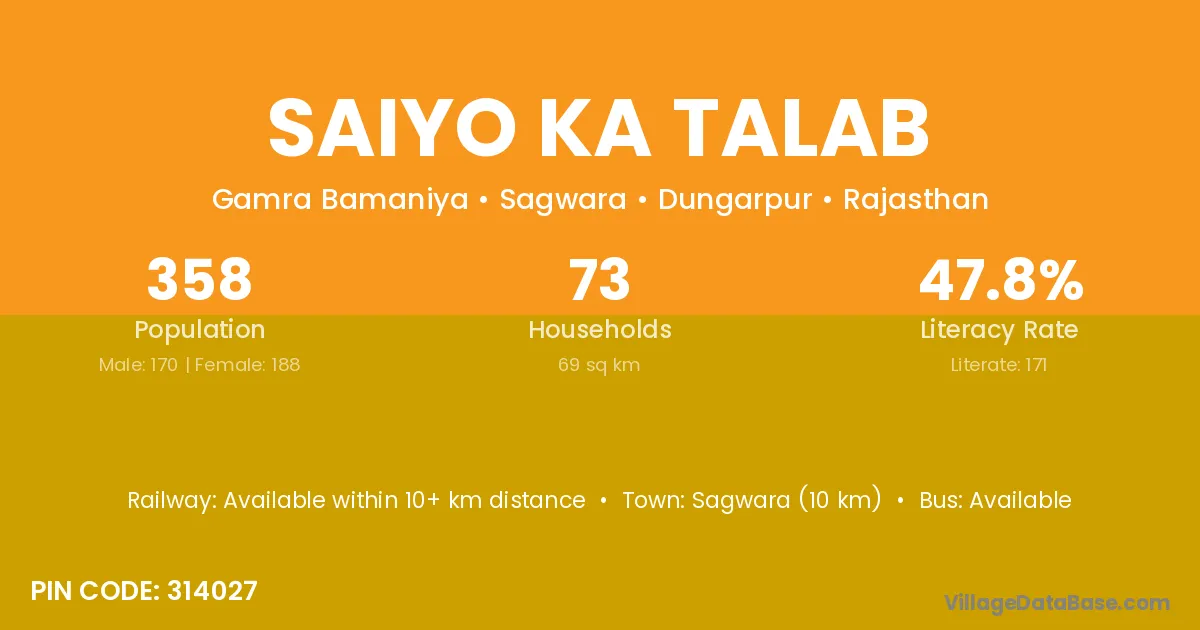 Sagwara (10 km) is the nearest town to Saiyo Ka Talab village for major economic activities and is located approximately 10 km away.