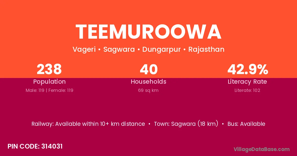Sagwara (18 km) is the nearest town to Teemuroowa village for major economic activities and is located approximately 18 km away.