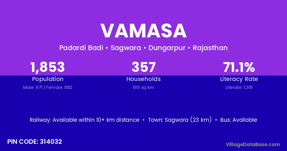 Sagwara (23 km) is the nearest town to Vamasa village for major economic activities and is located approximately 23 km away.