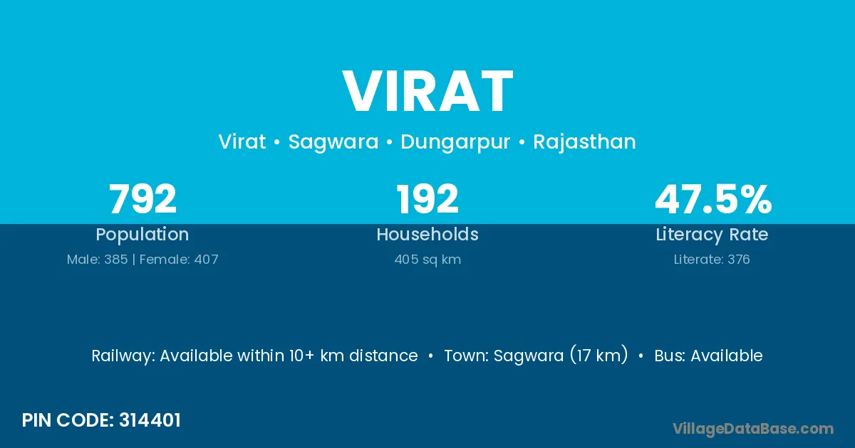 Sagwara (17 km) is the nearest town to Virat village for major economic activities and is located approximately 17 km away.