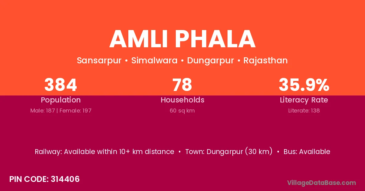 Dungarpur (30 km) is the nearest town to Amli Phala village for major economic activities and is located approximately 30 km away.