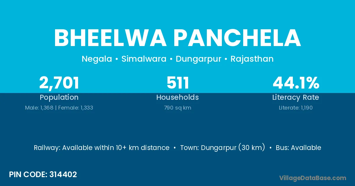 Dungarpur (30 km) is the nearest town to Bheelwa Panchela village for major economic activities and is located approximately 30 km away.