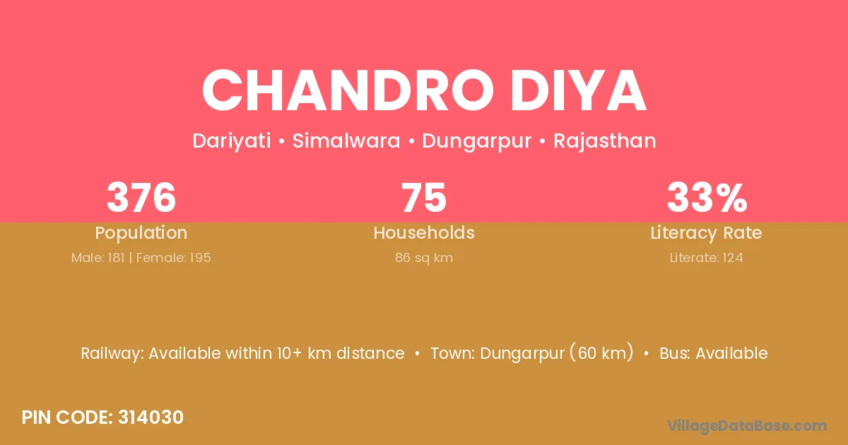 Dungarpur (60 km) is the nearest town to Chandro Diya village for major economic activities and is located approximately 60 km away.