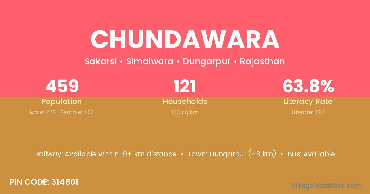 Chundawara village has a total population of 459 people, of which 237 are males and 222 are females.