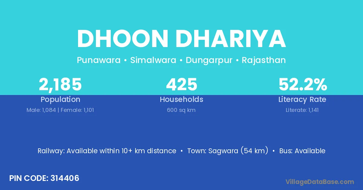 Sagwara (54 km) is the nearest town to Dhoon Dhariya village for major economic activities and is located approximately 54 km away.