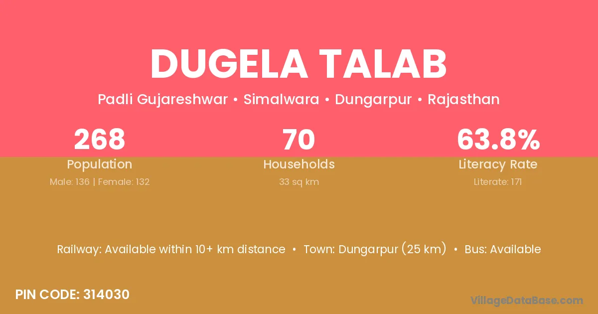 Dungarpur (25 km) is the nearest town to Dugela Talab village for major economic activities and is located approximately 25 km away.