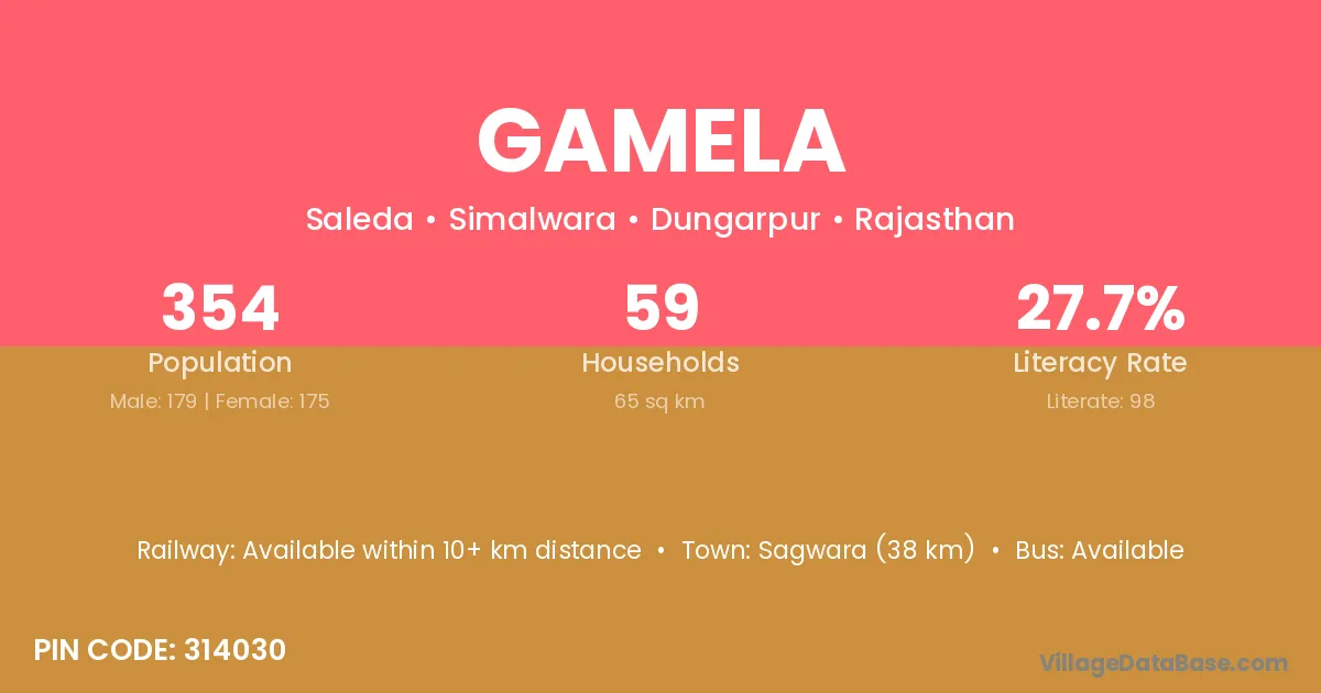 Sagwara (38 km) is the nearest town to Gamela village for major economic activities and is located approximately 38 km away.