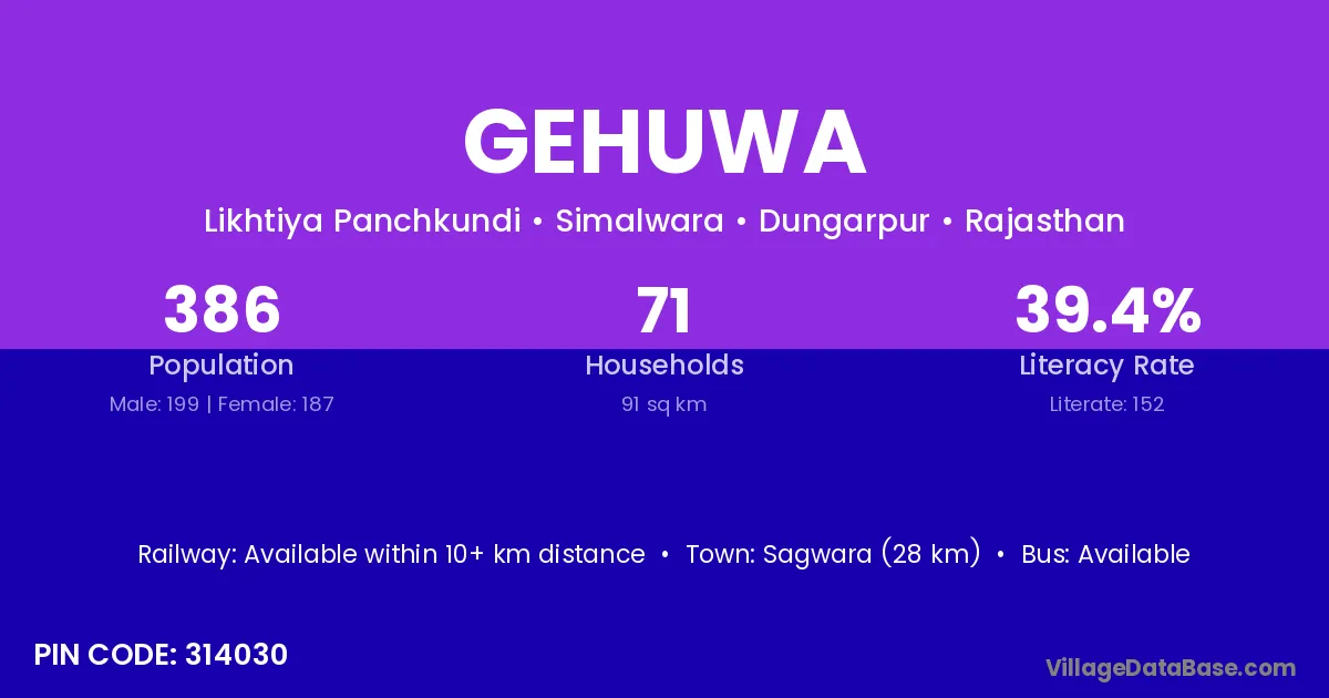 Sagwara (28 km) is the nearest town to Gehuwa village for major economic activities and is located approximately 28 km away.