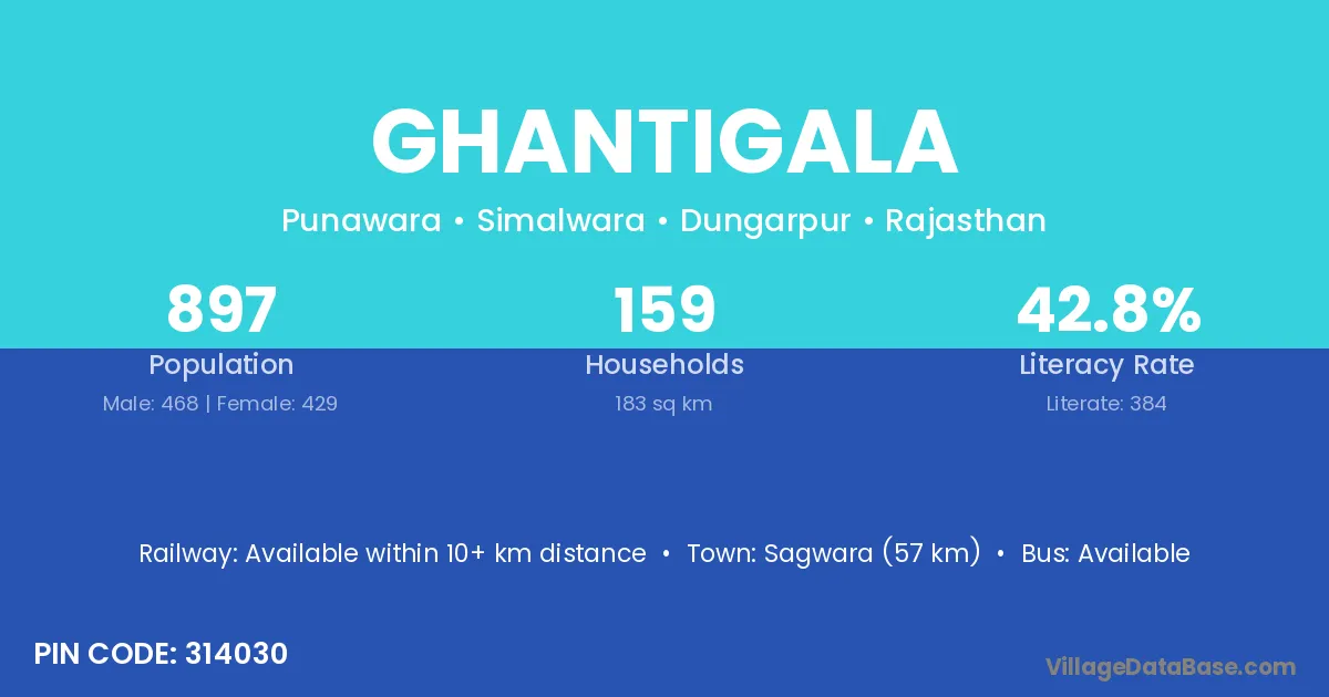 Sagwara (57 km) is the nearest town to Ghantigala village for major economic activities and is located approximately 57 km away.