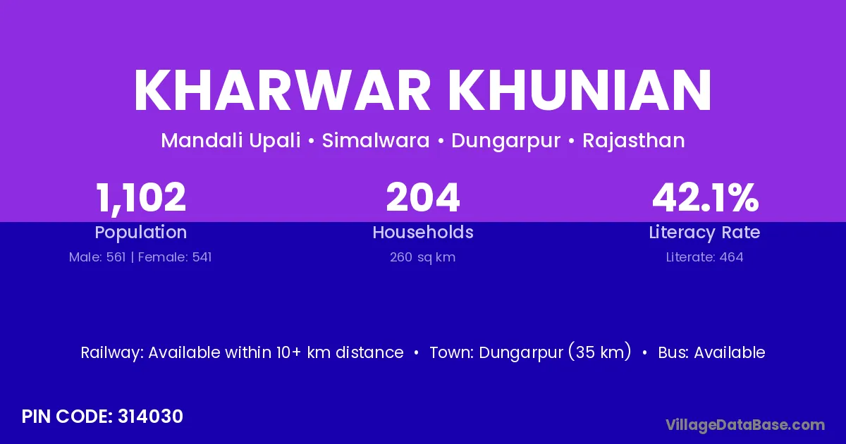 Dungarpur (35 km) is the nearest town to Kharwar Khunian village for major economic activities and is located approximately 35 km away.