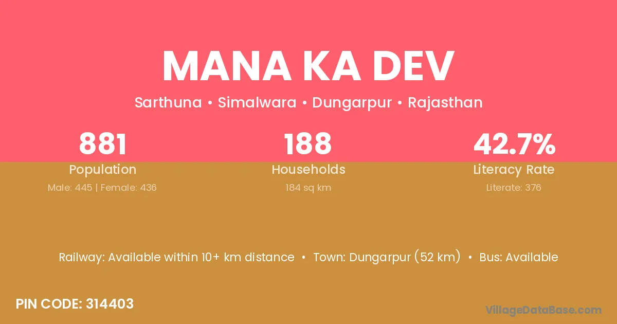 Dungarpur (52 km) is the nearest town to Mana Ka Dev village for major economic activities and is located approximately 52 km away.