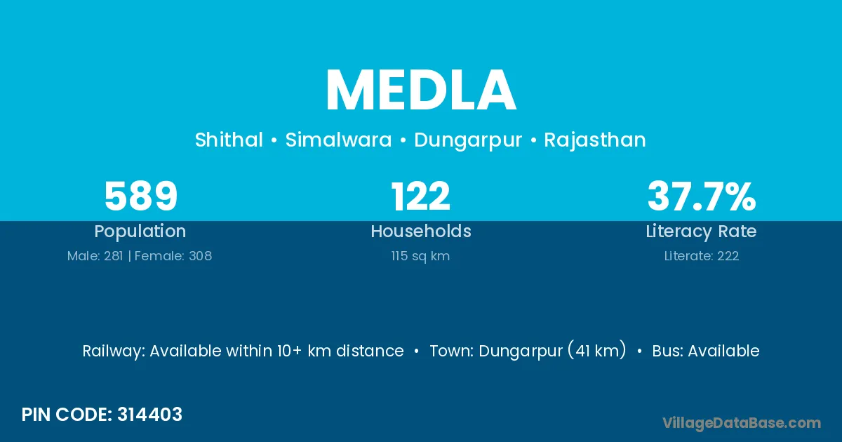Dungarpur (41 km) is the nearest town to Medla village for major economic activities and is located approximately 41 km away.