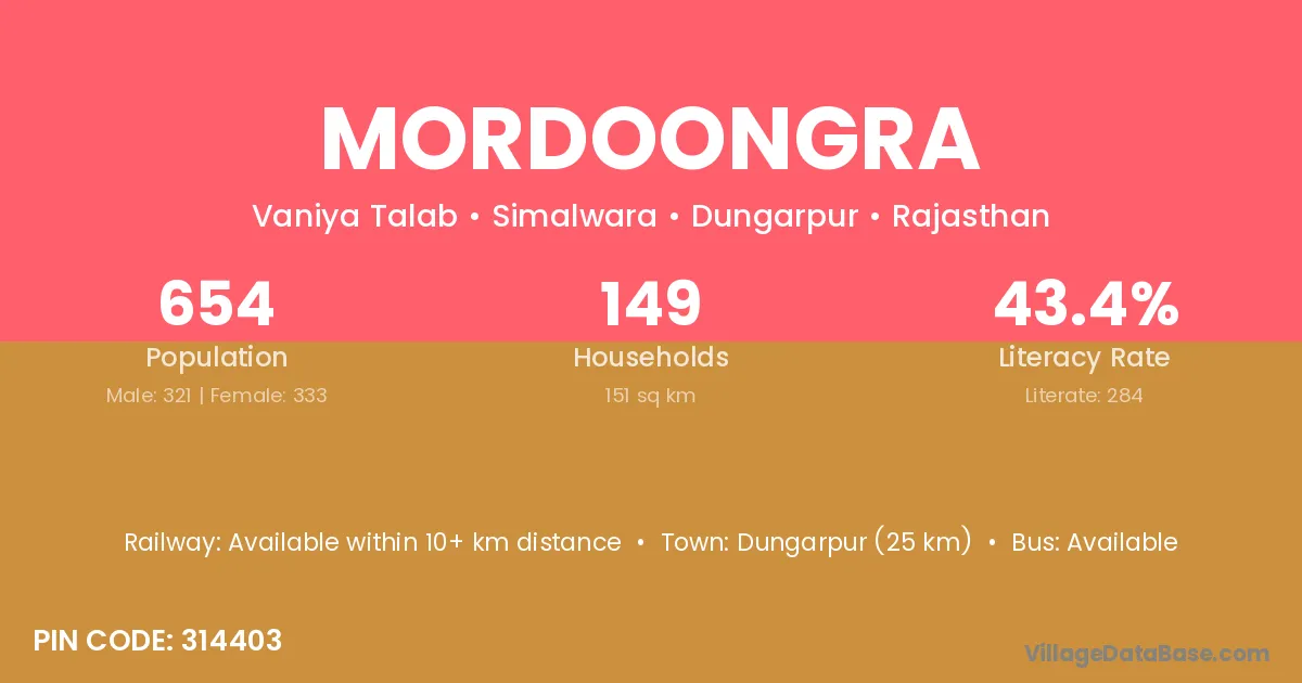 Dungarpur (25 km) is the nearest town to Mordoongra village for major economic activities and is located approximately 25 km away.