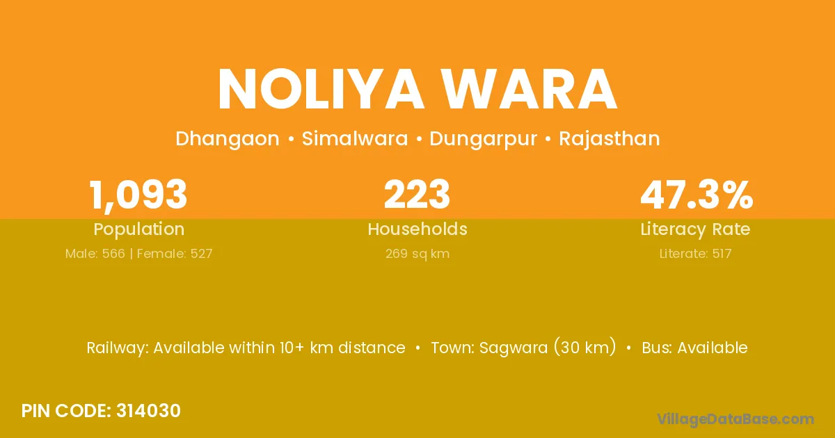 Sagwara (30 km) is the nearest town to Noliya Wara village for major economic activities and is located approximately 30 km away.