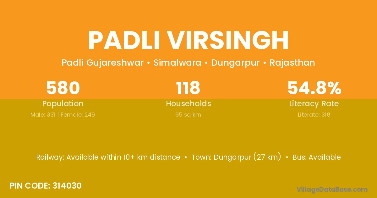 Dungarpur (27 km) is the nearest town to Padli Virsingh village for major economic activities and is located approximately 27 km away.