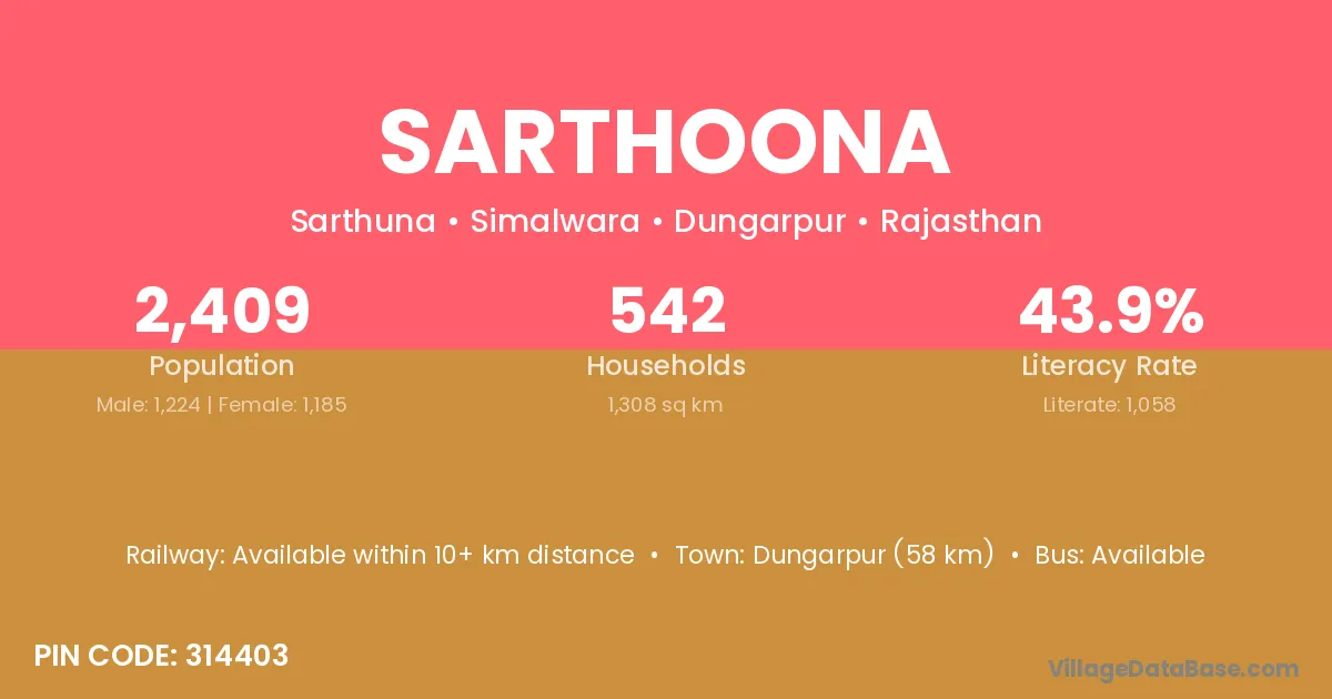 Dungarpur (58 km) is the nearest town to Sarthoona village for major economic activities and is located approximately 58 km away.