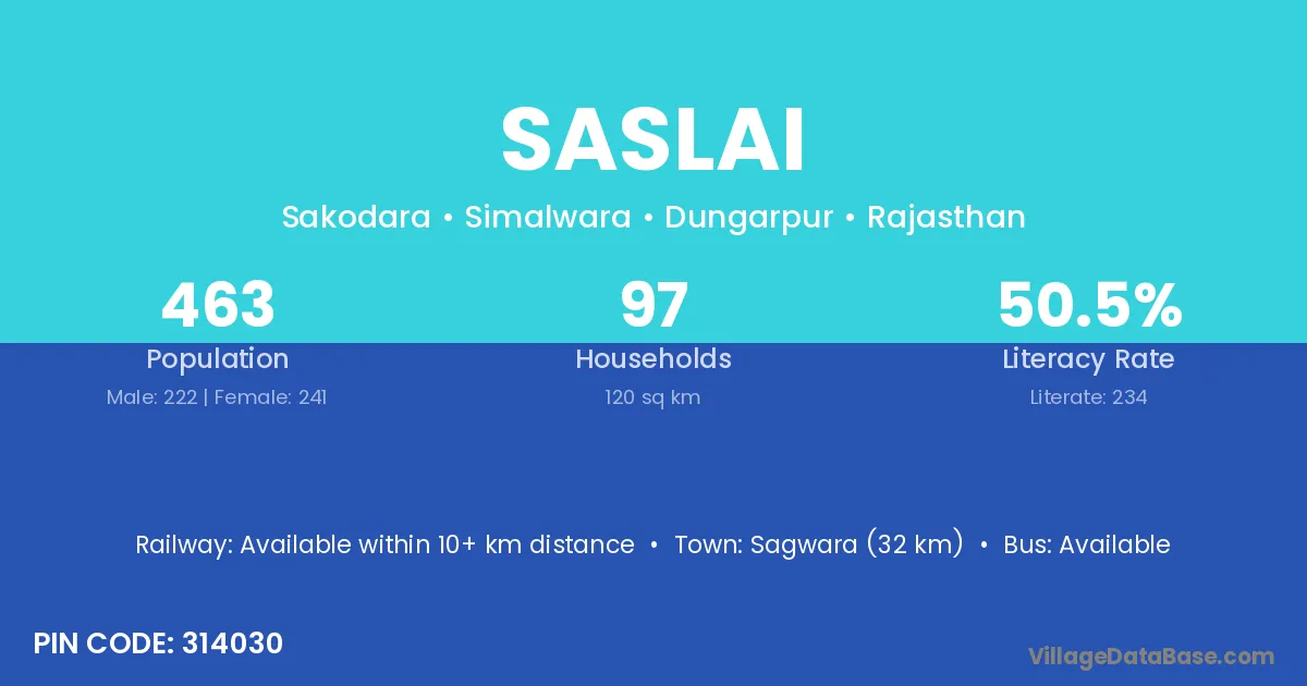 Sagwara (32 km) is the nearest town to Saslai village for major economic activities and is located approximately 32 km away.