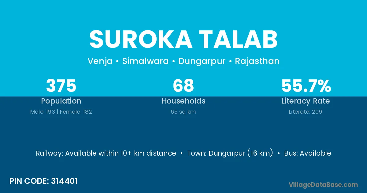 Dungarpur (16 km) is the nearest town to Suroka Talab village for major economic activities and is located approximately 16 km away.