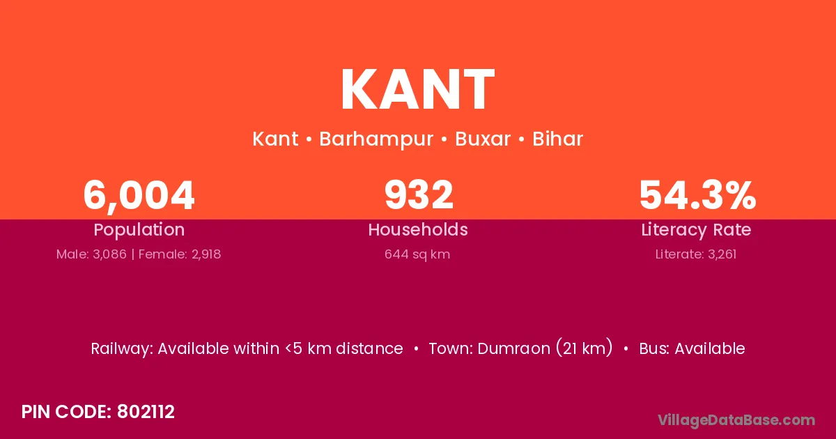 The literacy rate of Kant village is 50.89%. Male literacy stands at 65.20% and female literacy at 34.19%.
