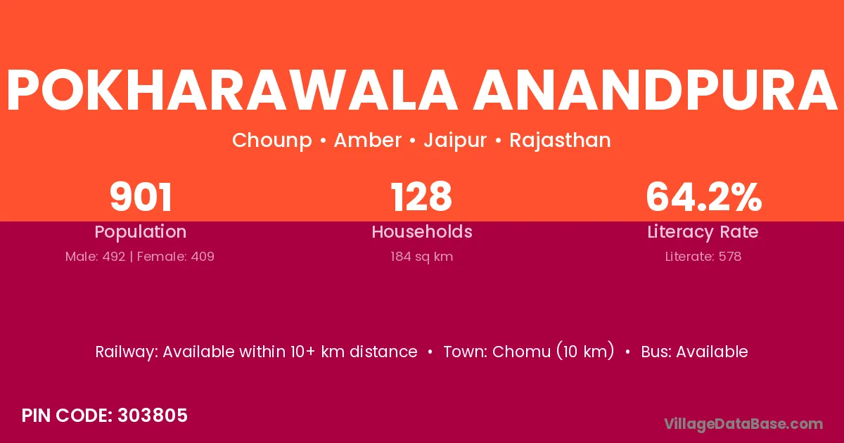 Chomu (10 km) is the nearest town to Pokharawala Anandpura village for major economic activities and is located approximately 10 km away.