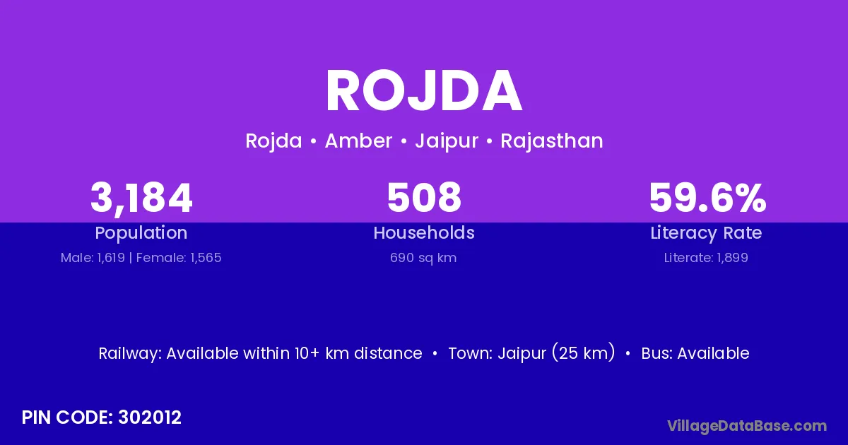 Jaipur (25 km) is the nearest town to Rojda village for major economic activities and is located approximately 25 km away.