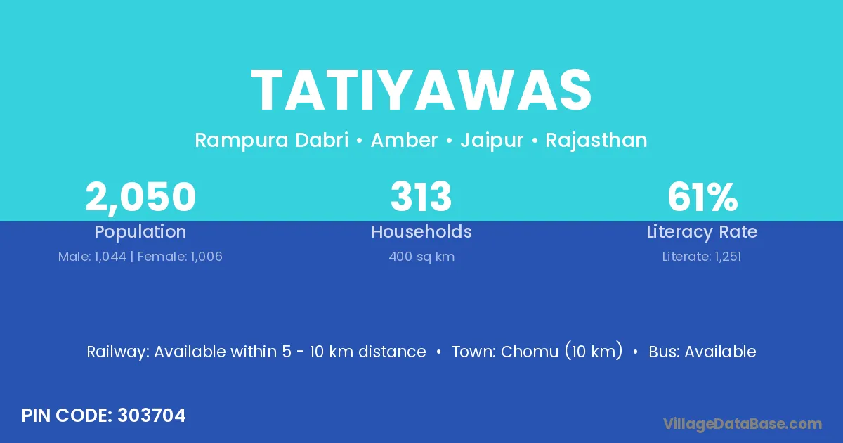 Chomu (10 km) is the nearest town to Tatiyawas village for major economic activities and is located approximately 10 km away.