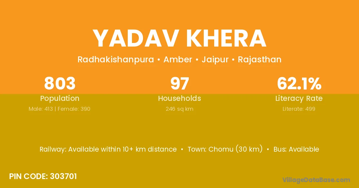 Chomu (30 km) is the nearest town to Yadav Khera village for major economic activities and is located approximately 30 km away.