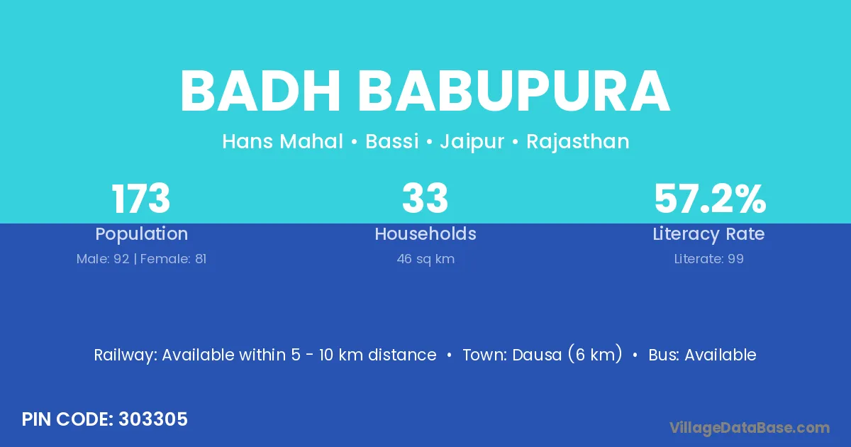 Dausa (6 km) is the nearest town to Badh Babupura village for major economic activities and is located approximately 6 km away.