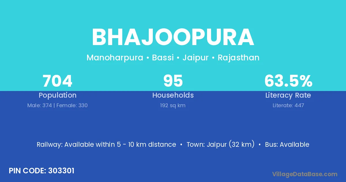 Jaipur (32 km) is the nearest town to Bhajoopura village for major economic activities and is located approximately 32 km away.