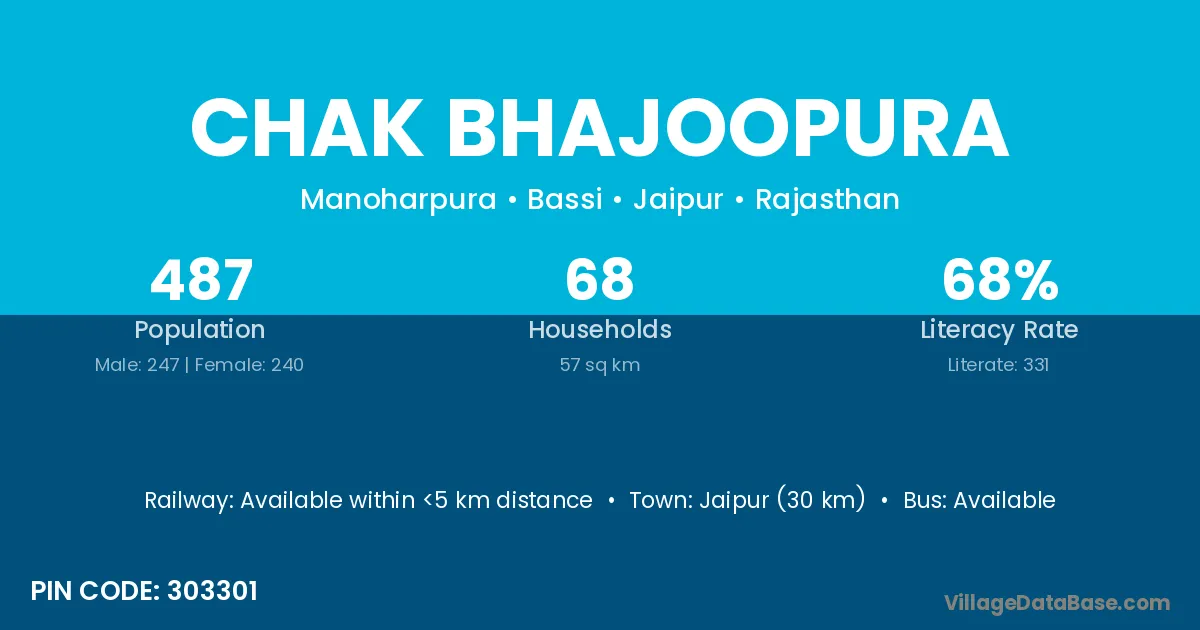 Jaipur (30 km) is the nearest town to Chak Bhajoopura village for major economic activities and is located approximately 30 km away.