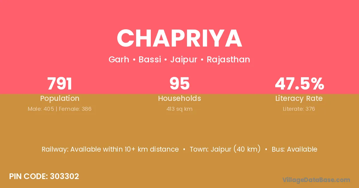 Jaipur (40 km) is the nearest town to Chapriya village for major economic activities and is located approximately 40 km away.