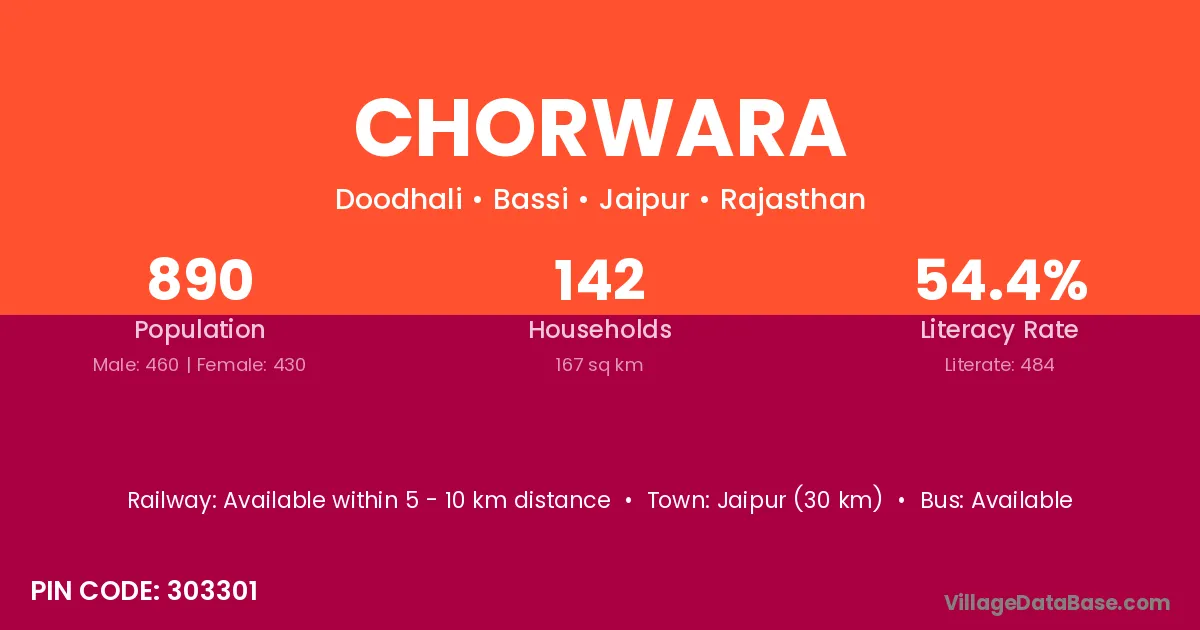 Jaipur (30 km) is the nearest town to Chorwara village for major economic activities and is located approximately 30 km away.