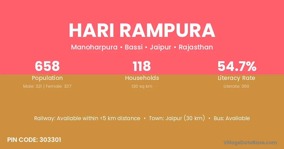 Jaipur (30 km) is the nearest town to Hari Rampura village for major economic activities and is located approximately 30 km away.