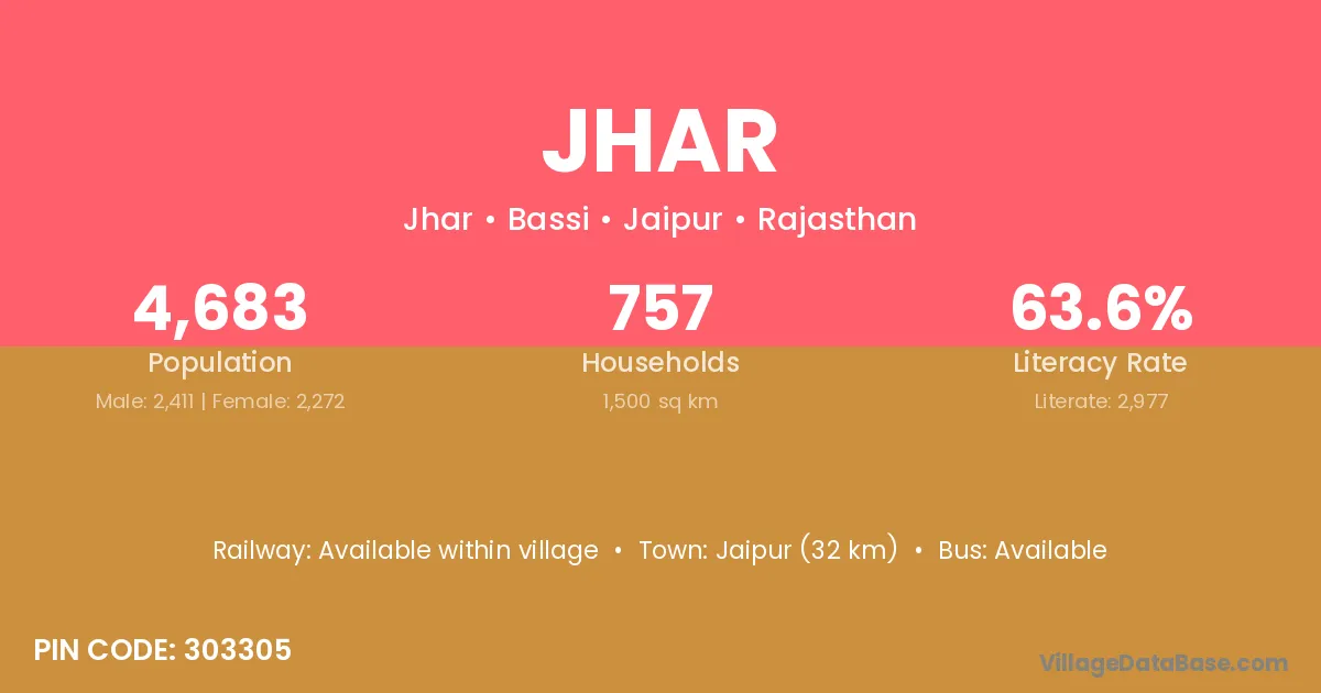 Jaipur (32 km) is the nearest town to Jhar village for major economic activities and is located approximately 32 km away.