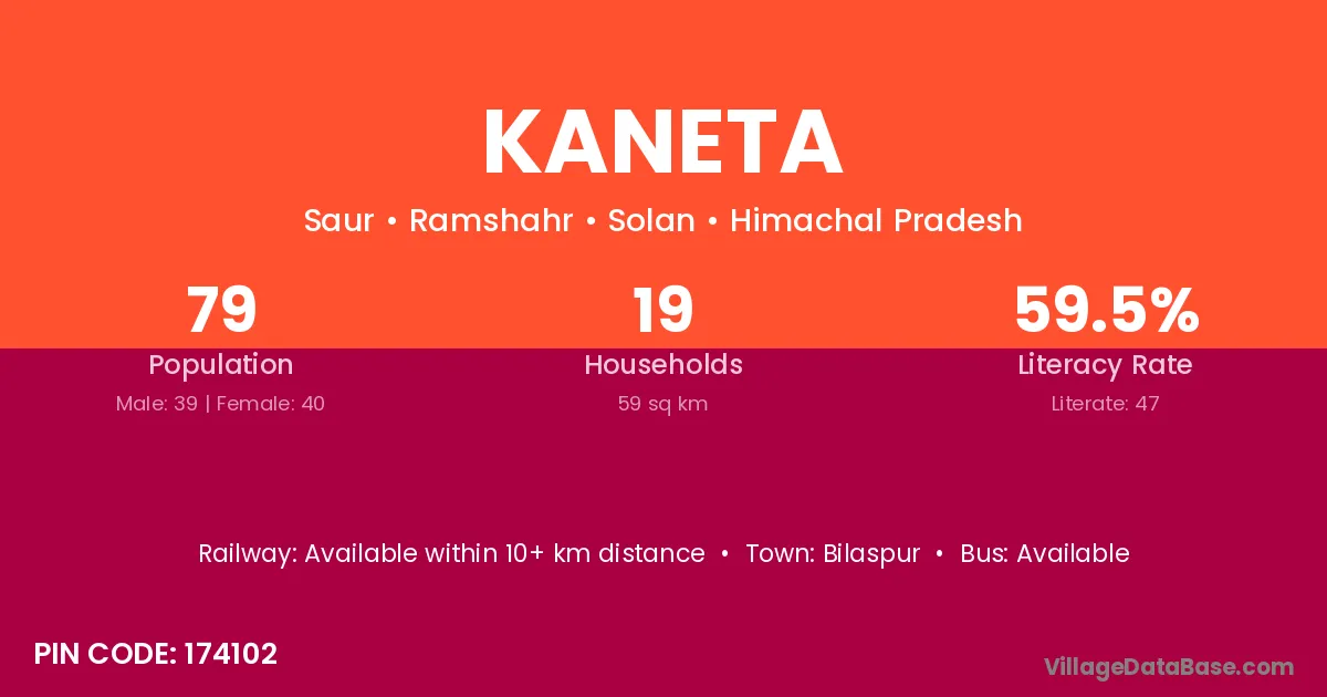 The literacy rate of Kaneta village is 56.05%. Male literacy stands at 68.95% and female literacy at 41.06%.