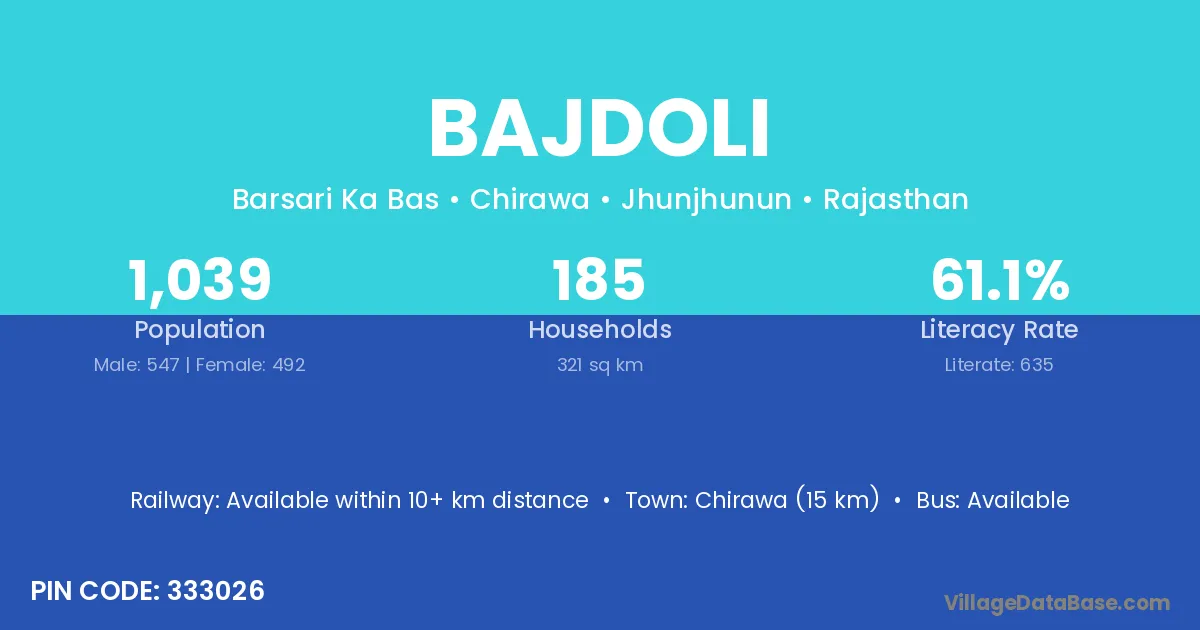Chaksu (25 km) is the nearest town to Bajdoli village for major economic activities and is located approximately 25 km away.