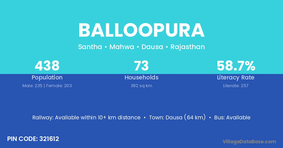 Chaksu (21 km) is the nearest town to Balloopura village for major economic activities and is located approximately 21 km away.