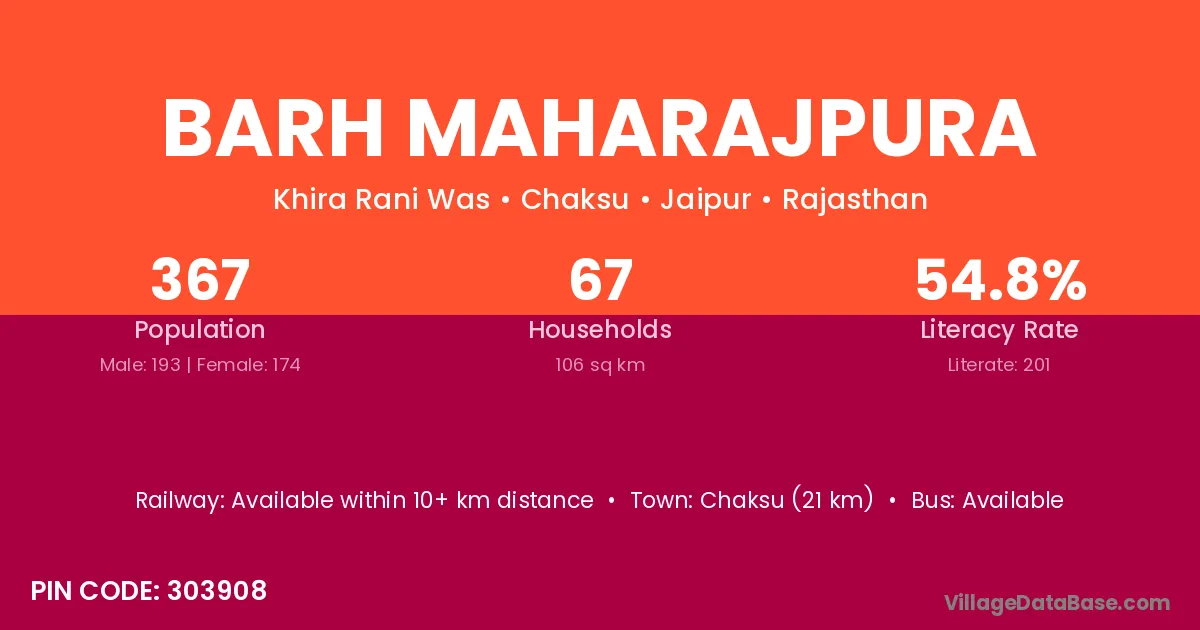 Chaksu (21 km) is the nearest town to Barh Maharajpura village for major economic activities and is located approximately 21 km away.
