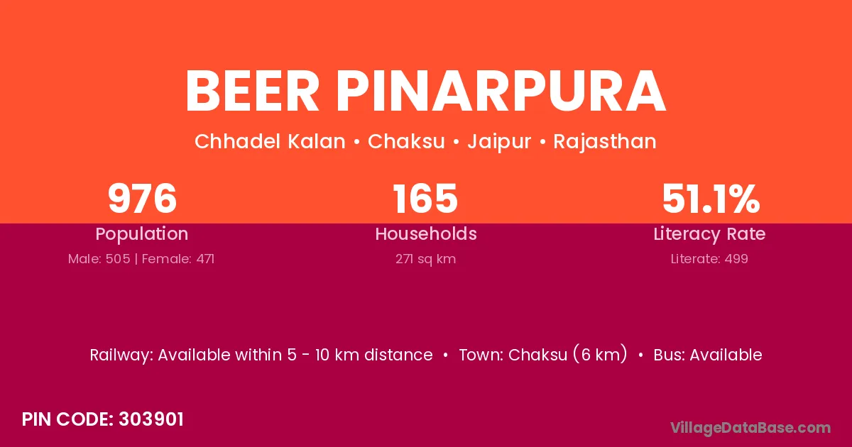 Chaksu (6 km) is the nearest town to Beer Pinarpura village for major economic activities and is located approximately 6 km away.