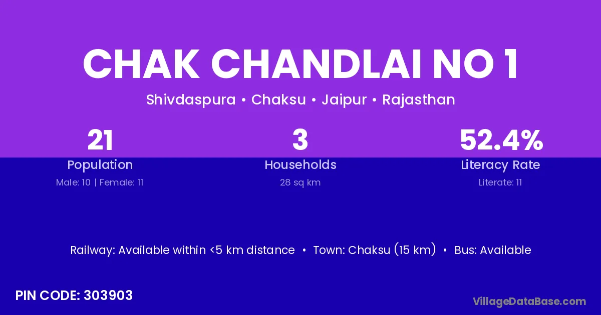 Chaksu (15 km) is the nearest town to Chak Chandlai No 1 village for major economic activities and is located approximately 15 km away.