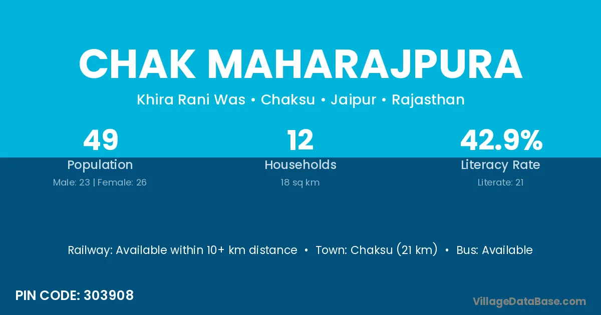Chaksu (21 km) is the nearest town to Chak Maharajpura village for major economic activities and is located approximately 21 km away.