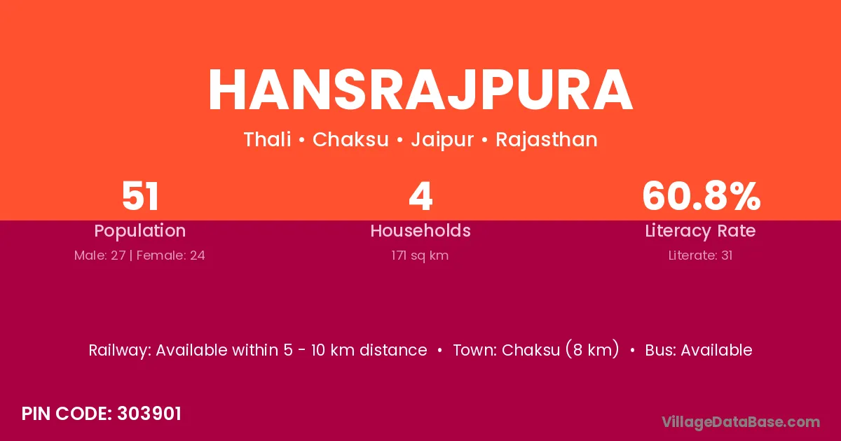 Chaksu (8 km) is the nearest town to Hansrajpura village for major economic activities and is located approximately 8 km away.