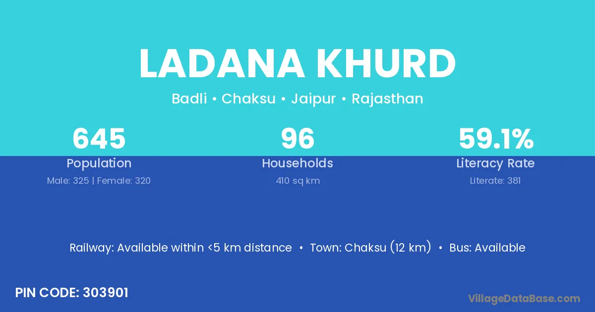 Chaksu (12 km) is the nearest town to Ladana Khurd village for major economic activities and is located approximately 12 km away.