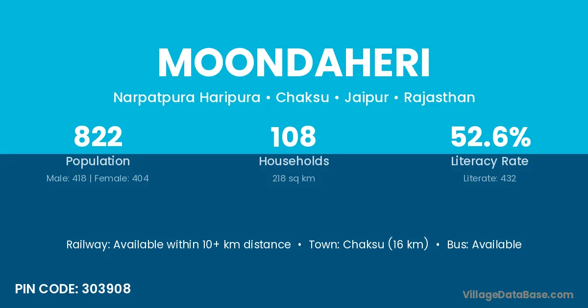 Chaksu (16 km) is the nearest town to Moondaheri village for major economic activities and is located approximately 16 km away.