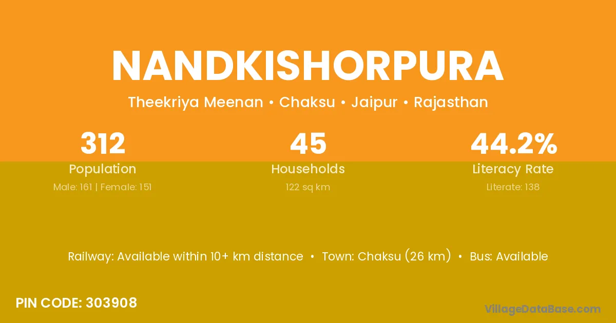Chaksu (26 km) is the nearest town to Nandkishorpura village for major economic activities and is located approximately 26 km away.