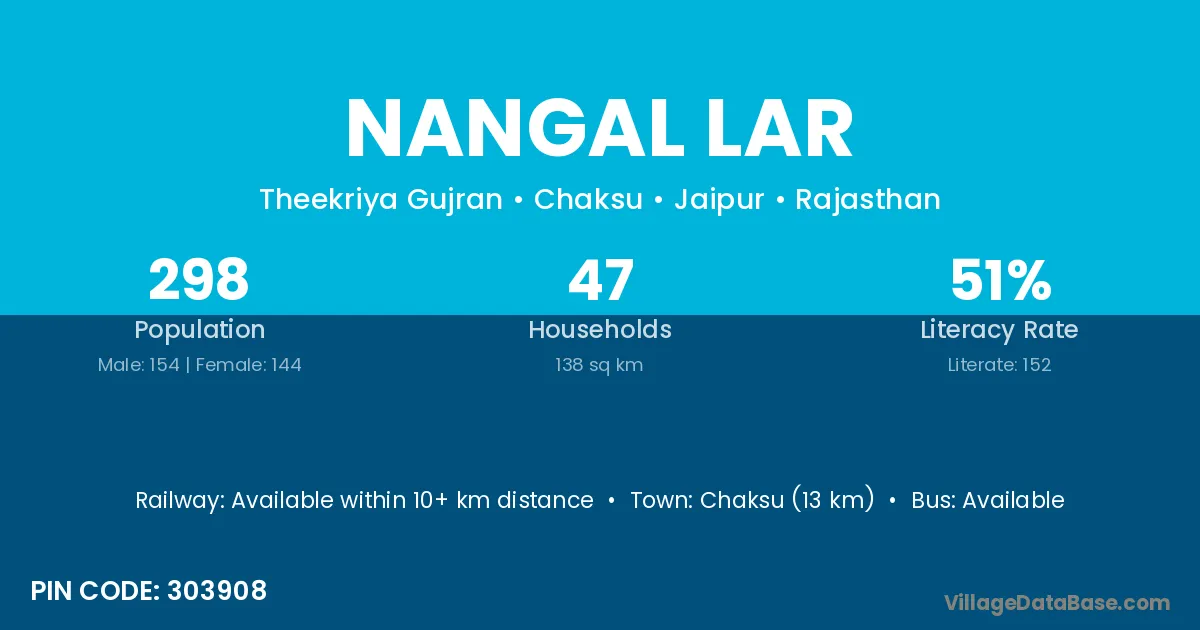 Chaksu (13 km) is the nearest town to Nangal Lar village for major economic activities and is located approximately 13 km away.