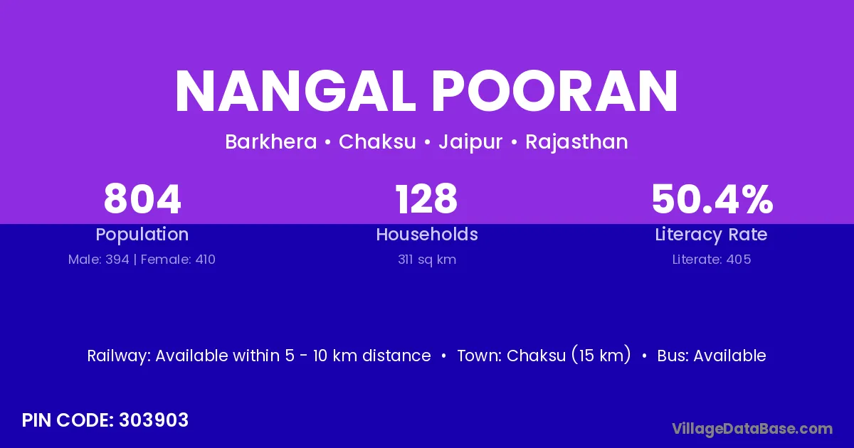 Chaksu (15 km) is the nearest town to Nangal Pooran village for major economic activities and is located approximately 15 km away.